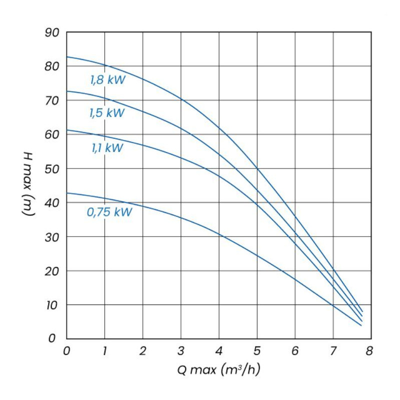 Maximální průtok až 100 l/min (6 m3/h) a výtlak až 65 m, díky čemuž zvládá i hlubší aplikace