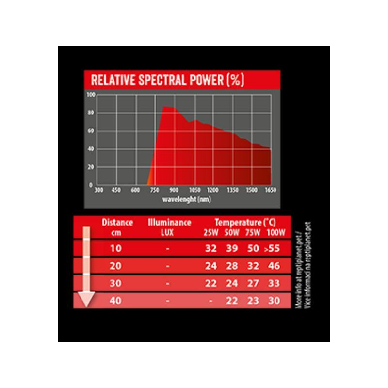 Žárovka REPTI PLANET Infrared Heat vytváří infračervené tepelné záření a je ideální v kombinaci se světelnými a UVB žárovkami (např. Repti Planet Daylight Basking Spot, Daylight Frosted, Daylight Neodymium, Repti UVB) nebo LED osvětlením. Zbarvení je dosaženo prostřednictvím červené barvy skla.