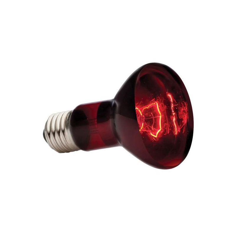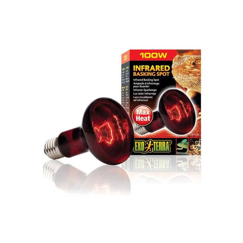 Žárovka Infrared Basking Spot 100W pro zajištění optimální teploty v teráriu a nenarušuje přirozenou aktivitu zvířat ani během noci díky svému slabě červenému světlu.
