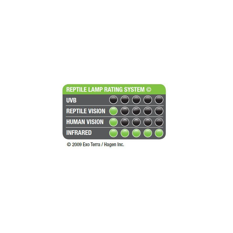 Žárovka Exo Terra Infrared Basking Spot 100 W se závitel E27 je infračervený zdroj světla a tepla v teráriu pro celý den i noc. Bodová žárovka Infrared Basking Spot vydává infračervené tepelné vlny, jako typické tepelná zářiče. Zvyšuje teplotu vzduchu ve svém okolí. V teráriu, nenarušuje přirozené životní cykly, podporuje trávení. Může být kombinována s žárovkami Day Glo nebo zářivkami Repti Glo. EXO TERRA infrared basking spot (100W)