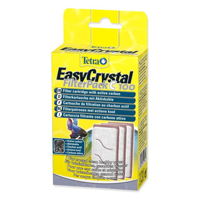 Náplň pro vnitřní filtr Tetra EasyCrystal FilterPack C 100. Kazeta tří filtrů s aktivním uhlím pro vodu čistou a zdravou. Filtrační vložka s aktivním uhlím k filtrům EasyCrystal Box. Výměna je rychlá a snadná. Pro dosažení nejlepších výsledků doporučujeme, abyste změnili filtrační kazetu každé čtyři týdny.