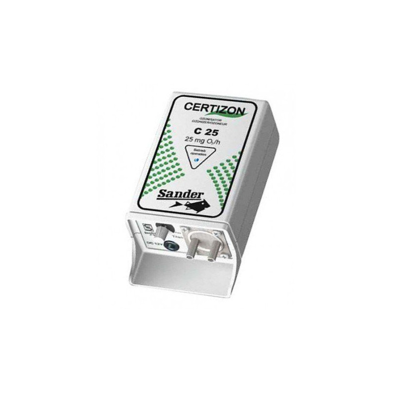 Sander akvarijní ionizér Certizon C25 je špičková ozonizační jednotka produkující ozón O3 25mg/h. Ionizátor s ovládáním výkonu se používá pro sladkovodní akvária do 500l, mořská do 250l, napojení 4mm. Přístroj lze provozovat jen se vzduchovým čerpadlem, jehož výkon odpovídá objemu nádrže.
