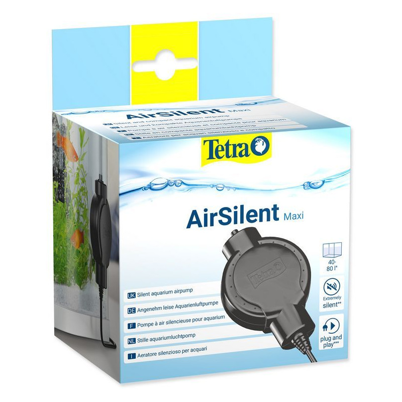 Akvarijní vzduchovací motorek Tetra AirSilent Maxi pro akvária s objemem od 40 do 80 litrů v kompletní sadě včetně vzduchového kamene, zpětného ventilu a hadice.
