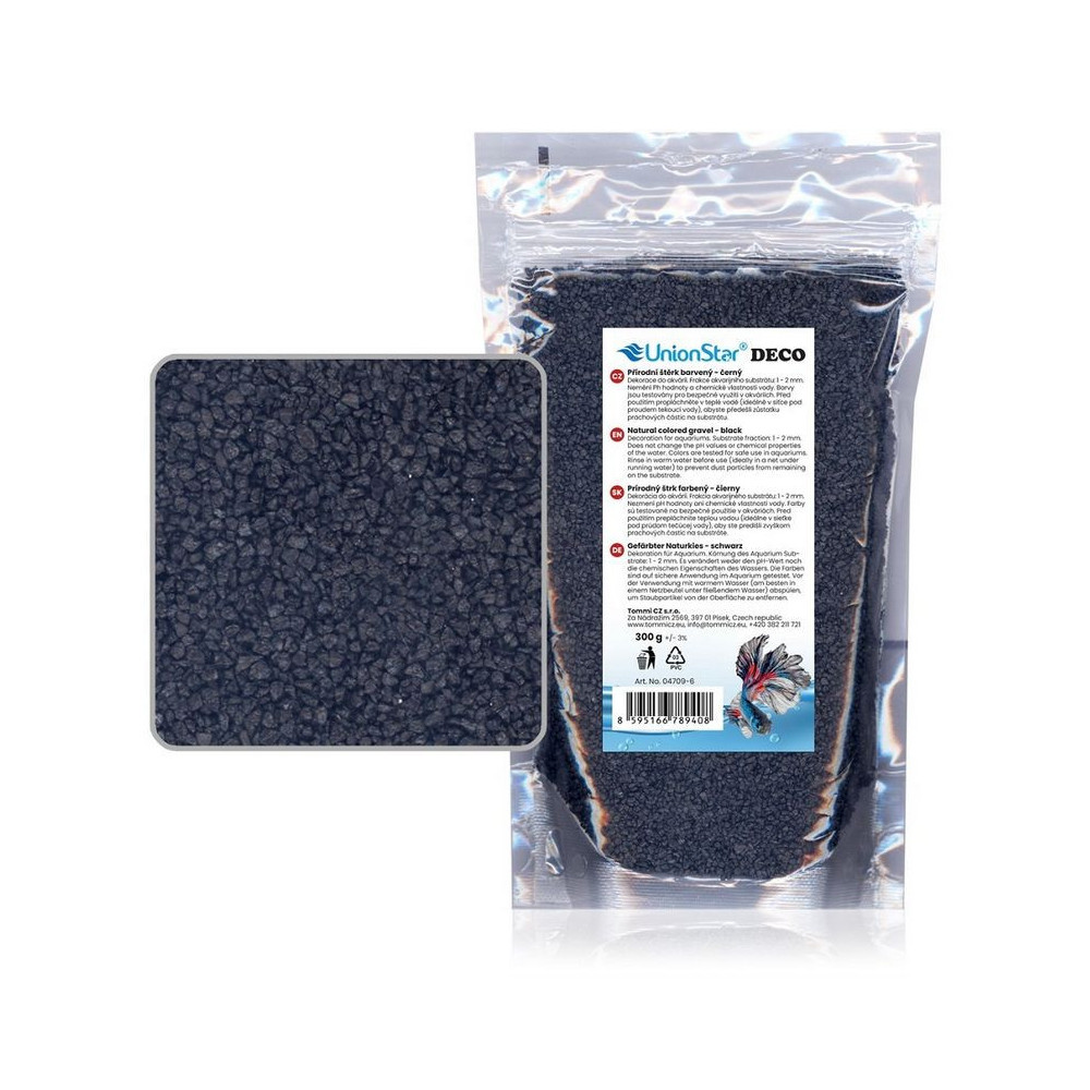 UnionStar černý akvarijní štěrk DECO 300 g (1–2 mm). Jemnozrnný přírodní substrát, bezpečný pro ryby i rostliny. Neutrální pH, elegantní vzhled akvária.