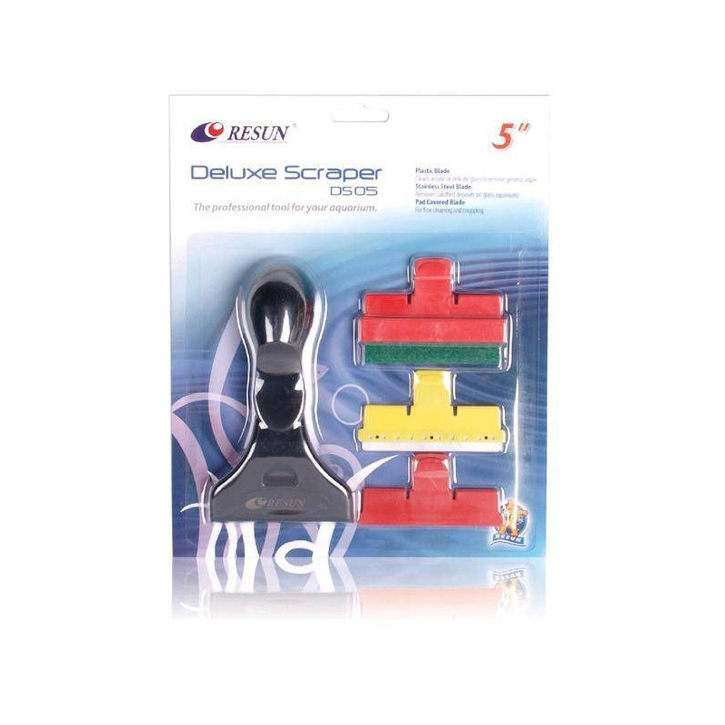 Profesionální škrabka do akvária Resun Deluxe 05 s výměnnými nástavci na čištění skla. Plovoucí držák škrabky na sklo Deluxe Scraper DS05 zamezí potopení do akvária. Tři výměnné čepele pro různé typy čistění.