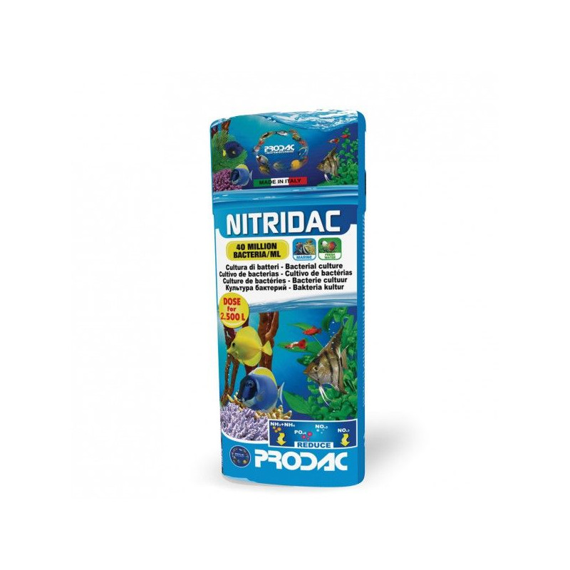 Prodac Nitridac 250 ml – živé bakterie pro čistou, stabilní a zdravou akvarijní vodu. Vysoce koncentrované bakterie pro odstranění čpavku, dusitanů a fosfátů. Zlepšují kvalitu vody, brání zákalu a stabilizují akvárium. Pro sladkou i mořskou vodu.