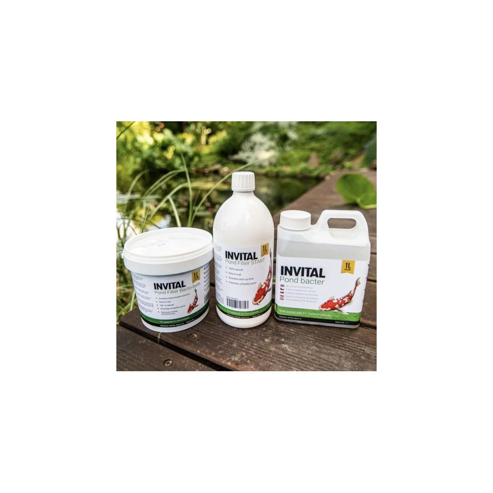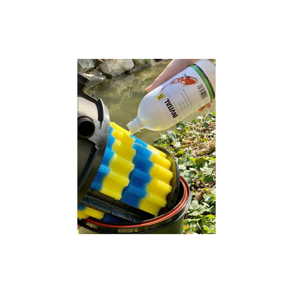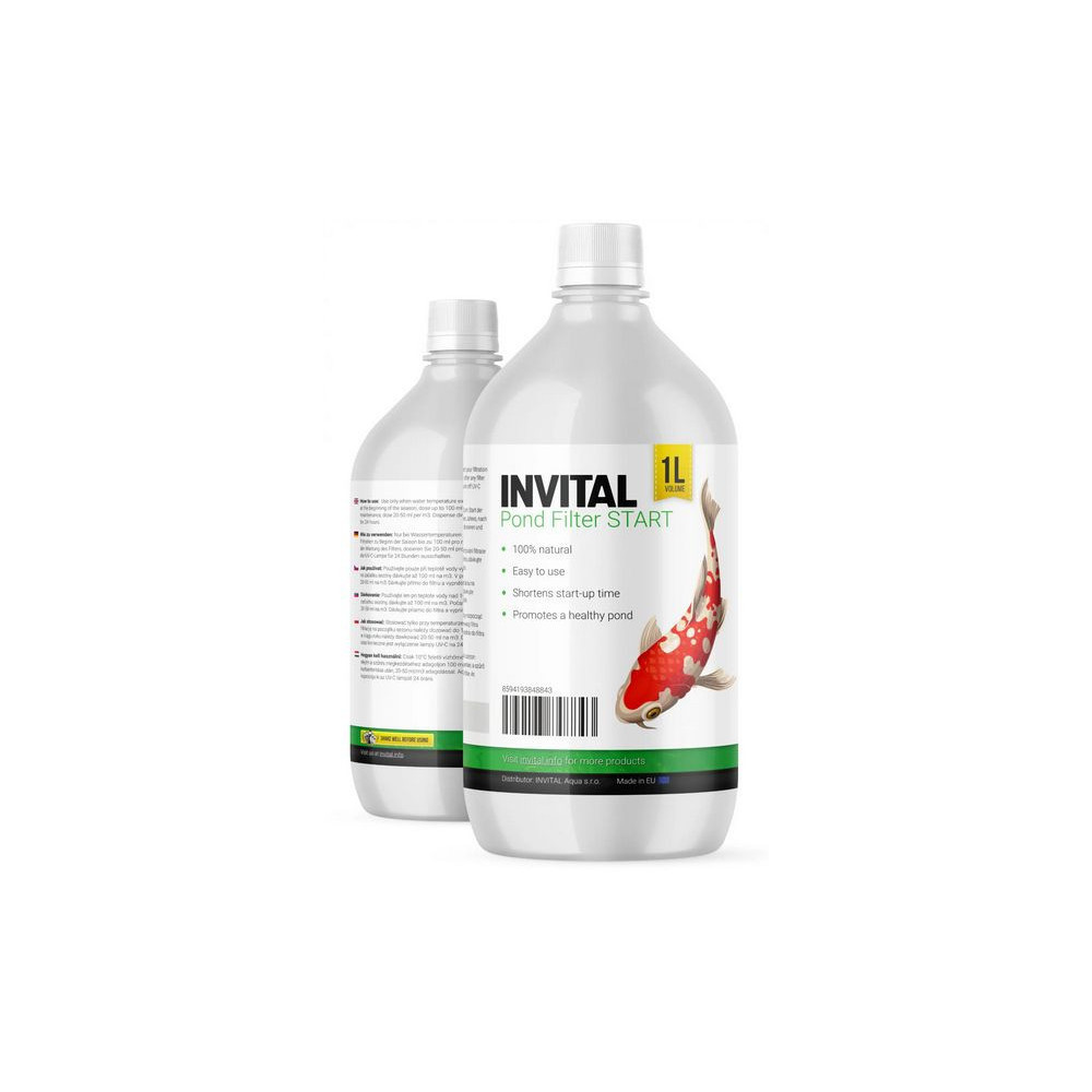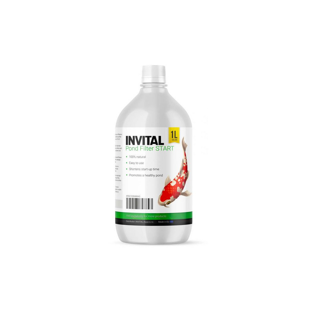 INVITAL Pond Filter Start (1000 ml) – Vysoce koncentrované gelové bakterie pro okamžitý start jezírkové filtrace. Díky husté gelové formě se snadno přichytí na filtrační houby a urychlí čištění vody. Snižuje výskyt řas a kalu. Bezpečné pro ryby i rostliny.