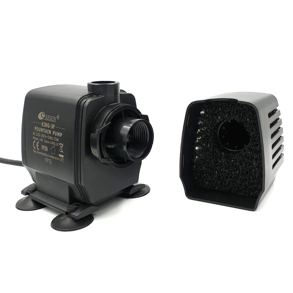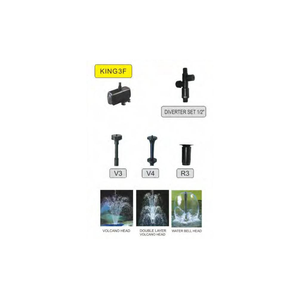 Jezírkové fontánové čerpadlo Resun King 3F , 2400 l/h, 35W, jehož součástí jsou fontánové trysky, je vhodné jako čerpadlo pro vodotrysk, vodopád, pro mořskou slanou vodu. Čerpadlo do jezírka vybaveno keramickou hřídelkou a možností napojení hadic na sání. Víceúčelové čerpadlo do jezírka King 3 lze instalovat ve vodorovné i svislé poloze. Čerpadla do jezírek řady King pracují ponořené, ale pokud jsou protékající vodou dostatečně chlazené ( max. teplota čerpané vody 35°C), je možné je použít i vně nádrže.Na výstup čerpadla lze připojit běžné výustky (závit, hadicovou sponu).Po sejmutí filtrační náplně s krytem lze k čerpací jednotce připojit i vstupní hadice, čímž lze použít čerpadlo i pro vnější přečerpávání.Čerpací jednotka má keramickou osu rotoru a keramické vypouzdření. Lze ho použít jako čerpadlo pro sladkou vodu nebo čerpadlo pro mořskou vodu. Kovová část rotoru je potažena plastem.Určeno pro fontánové nástavce V3 - 1/2", V4 - 1/2", R3 - 1/2. Ilustrační fota fontánových efektů. Jejich velikost je vždy závislá na výkonu čerpadla a druhu trysky.