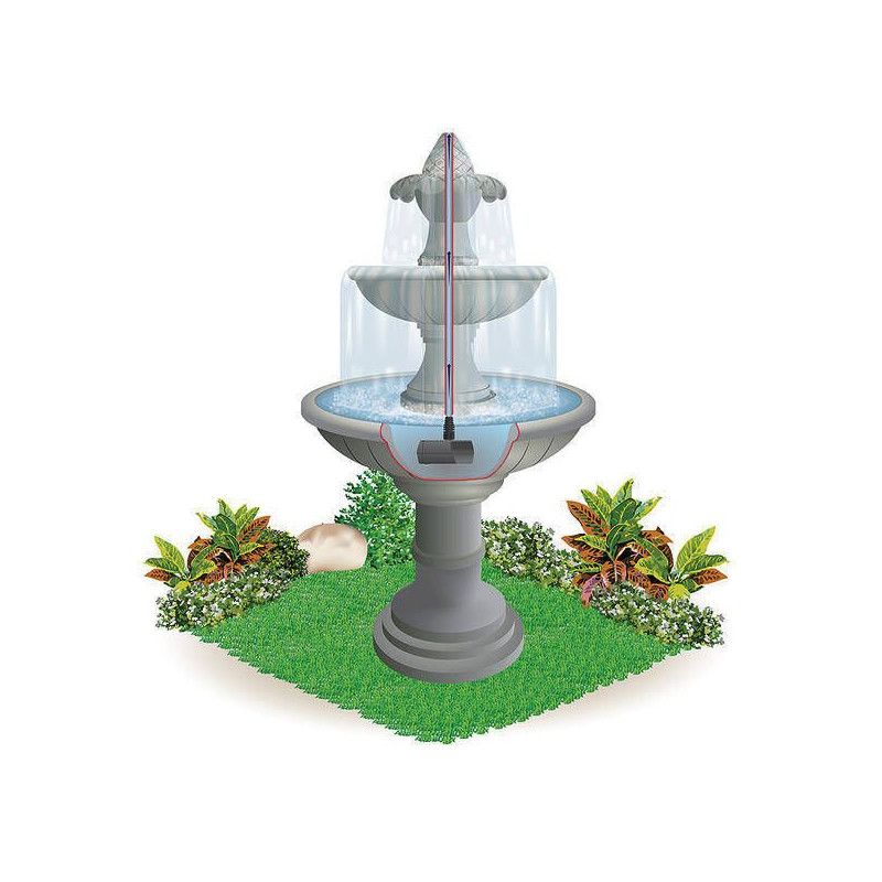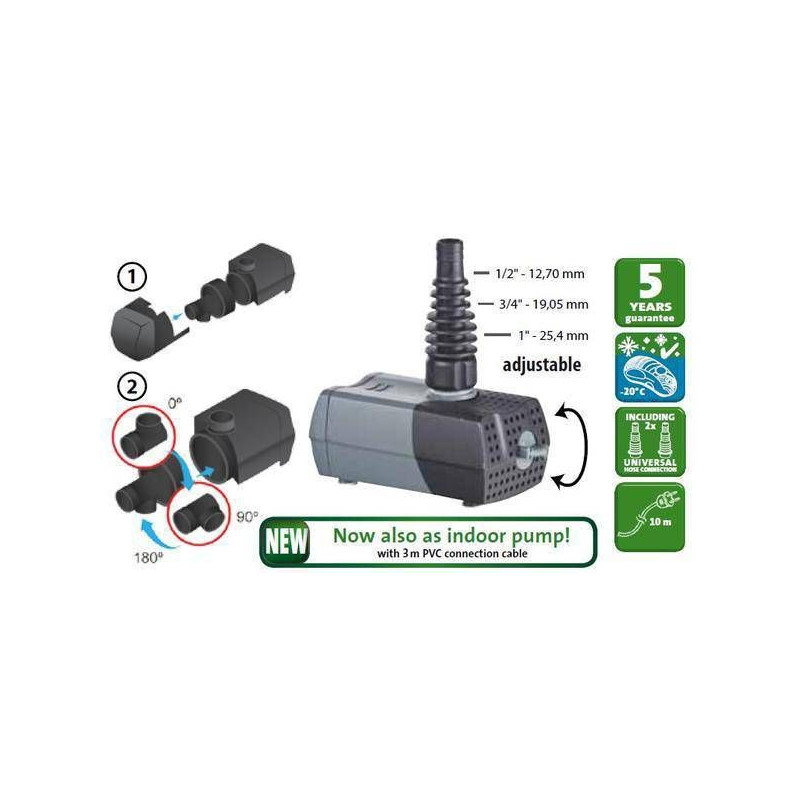 - Regulovatelný výkon: Průtok vody lze snadno nastavit v rozmezí 1400 – 2100 l/h, což umožňuje precizní ovládání výšky fontány nebo intenzity chrliče.