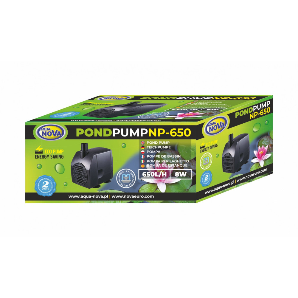 Fontánové jezírkové čerpadlo Aqua Nova NP-650 l/h, výtlak max. 1,1 m najde uplatnění jako čerpadlo na fontánu, vodotrysk a cirkulaci vody v zahradním jezírku. Protože může být použito jako fontánové čerpadlo, jsou součástí dodávky i dvě fontánové trysky. S tímto čerpadlem můžete napájet zahradní fontánu. Do domácích fontán jsou vhodná malá interiérová čerpadla na bezpečné napětí. Průtok čerpadla do jezírka Aqua Nova můžete ovlivňovat otáčením regulace u sání a velikost fontány pomocí kohoutu před fontánovým nástavcem. Výhodami tohoto čerpadla jsou jednoduchá údržba, vysoký výkon a nízká spotřeba elektrické energie. Dlouhou životnost zajišťuje keramická osa, odolná proti korozi a vodě. Další výhodou je ochrana proti přehřátí ve formě tepelné pojistky, která automaticky vypne čerpadlo. Odolný plastový kryt. Čerpadla Aqua Nova řady NP jsou vhodná pro jezírka, akvária a fontány. Jednoduchá údržba a demontáž rotoru.
