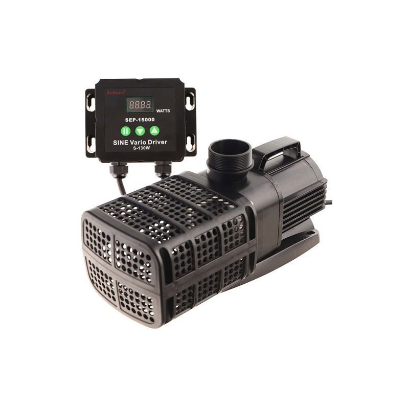 Jebao SEP-15000 čerpadlo s regulací průtoku vody. Filtrační čerpadlo pro zahradní jezírka se samostatným ovladáním výkonu. Toto jezírkové čerpadlo dovoluje použítí také pro nádrže se slanou vodou. Proud vody je možné regulovat pomocí ovládání v rozsahu 30-100 % výkonu, a tímto také snížit spotřebu elektřiny. Tlačítka pauza slouží k zapnoutí a vypnutí čerpadla. Mezi pozitiva patří nízká hlučnost při provozu čerpadla, keramická osa, která zaručuje dlouhou životnost čerpadla.