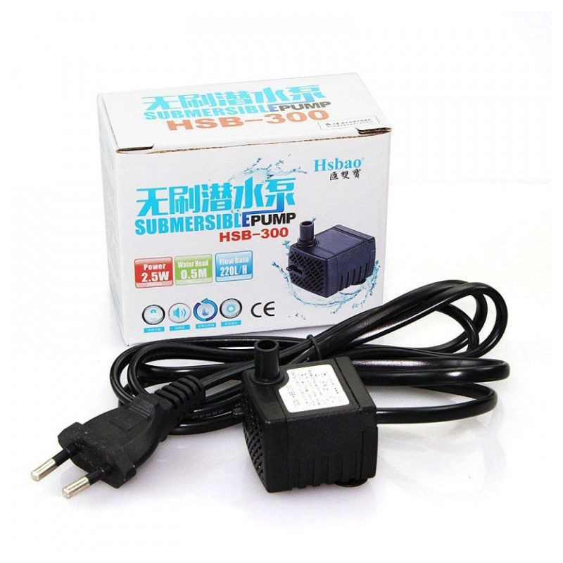 Vodní čerpadlo Hsbao HSB-300, průtok max 220 l/h, s moderním systémem čerpání vody zaručuje dlouhodobý provoz a vysokou účinnost. Je vhodné do domácích fontán, akvarií a terárií.