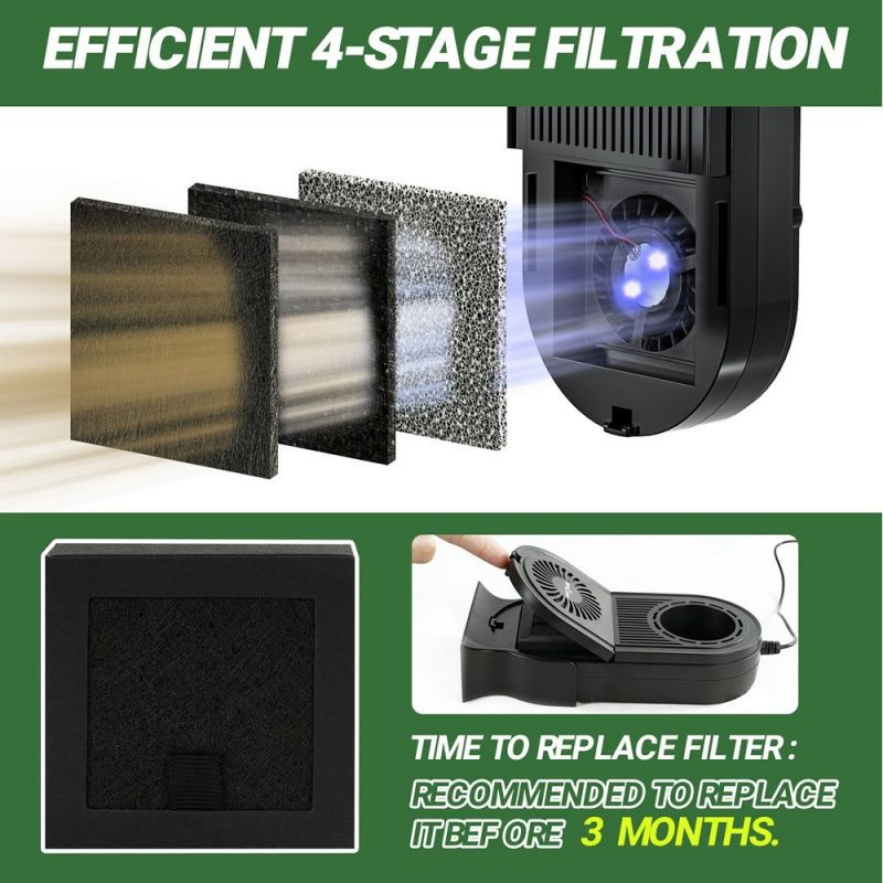 Díky čtyřstupňové filtraci včetně aktivního uhlí účinně odstraňuje pachy, znečištění a škodlivé částice z ovzduší, čímž zajišťuje zdravé a bezpečné prostředí pro chované živočichy. Vestavěná UV germicidní lampa navíc pomáhá eliminovat mikroorganismy a zvyšuje úroveň hygieny.