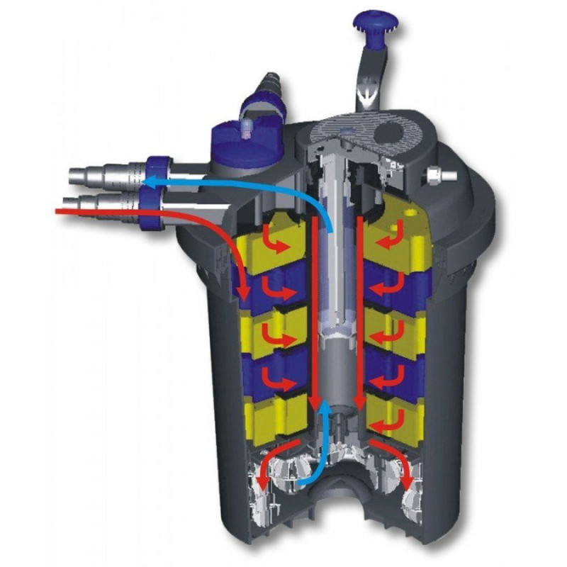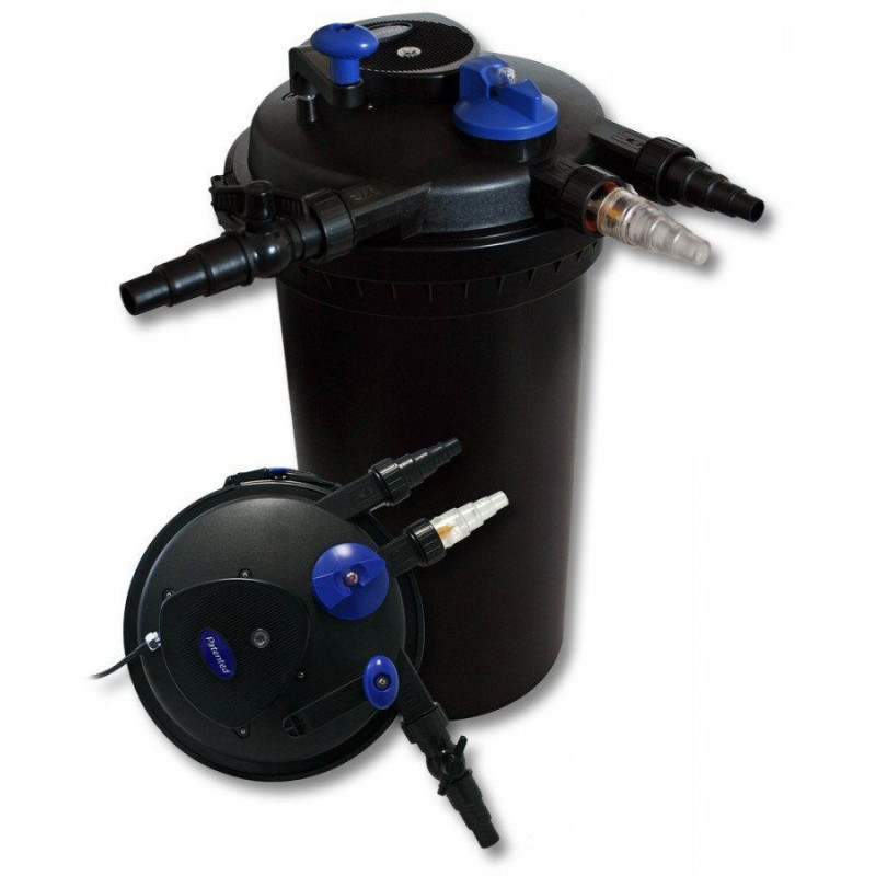 Tlakový filtr AV 15000 s UV lampou 18W pro jezírka s rybami do 15 000 l, bez ryb do 30 000 l. Vestavěná UV lampa 18W, která vodu dočišťuje tak, že ji zbavuje řas a parazitů. Tento filtr obsahuje i integrovaný systém čištění, který velice usnadňuje provoz filtru. Obsluha je velice jednoduchá, pouze vypnete přívod vody do filtru, kličkou na hlavě filtru zatočíte čímž vyčistíte filtrační média. Poté přepnete směr vytékání vody pomocí přepínače na odtokovou hadici a vypláchnete znečištěnou vodu z filtru. Výtok špinavé vody je na hadice 25/32/40 mm. Veškerá elektroinstalace a funkční prvky jsou uzavřené a tak můžete filtr bez problému schovat do země vedle jezírka pod kámen.