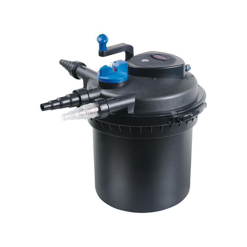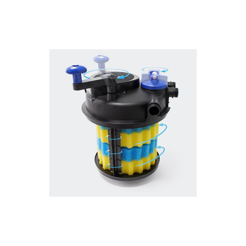Unikátní na této filtraci je, že má kliku, pomocí které můžete filtrační média vyždímat, aniž by jste ji museli otevírat. Na hadicový výstup pro čištění lze připojit další hadici a přepnutím ventilu nečistoty z filtru vypláchnout. Filtr lze umístit jak na břeh jezírka nebo zakopat až po víko do země. Může být také ukryt v šachtici vedle rybníčku. Pokud připojíte výkonné čerpadlo, dá se čistá voda použít k napájení potůčků nebo vodopádů do maximální výšky 3 metrů. Integrovaná UV lampa likviduje plovoucí řasy.