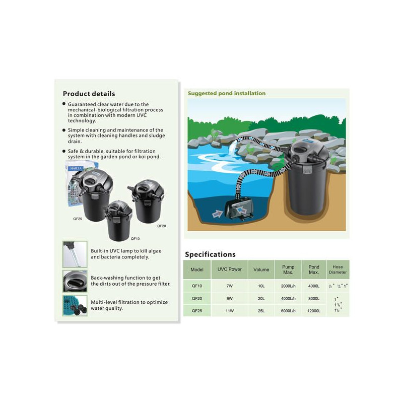 Tlaková filtrace Hailea QF10 včetně 7 Wattové UV pro jezírka do malá jezírka do 4000 litrů vody