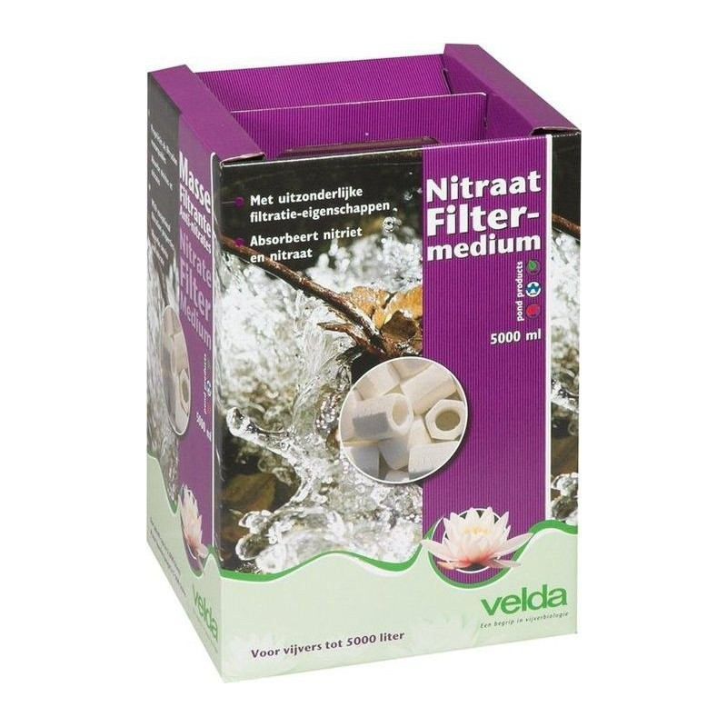 Velda - Nitraat filtermedium 5000 ml, je účinné filtrační médium ze sklokeramiky určené k odbourávání dusičnanů a dusitanů. Kromě toho mají keramické částice hexagonální strukturu a jsou opatřeny tunelem, který zajišťuje dostatek kyslíku pro bakterie v ostatních filtračních médiích. Filtrační médium nasypte do filtračního sáčku (součástí balení) a vložte do určené filtrační komory, nebo přímo do proudící vody v jezírku (potůček, prameniště, výtok z filtrace.)