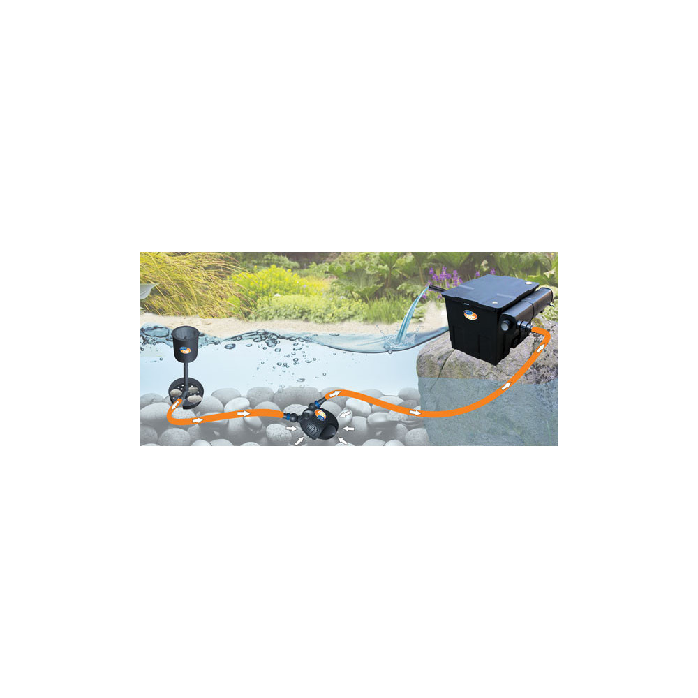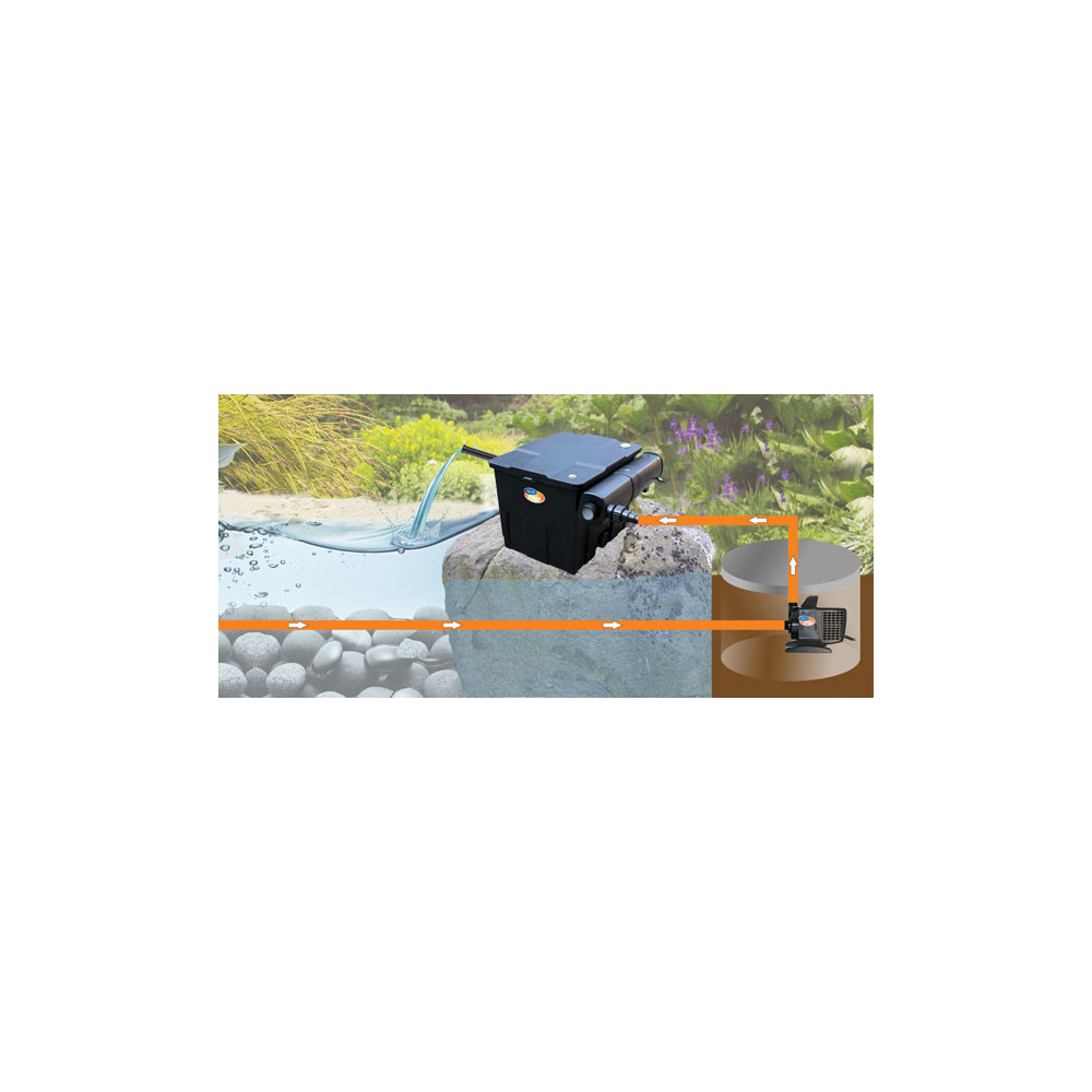 Rybníčková filtrace s kokosovou deskou zachycuje hrubé nečistoty a pěnovými molitany, které osídlí čistící bakterie filtruje ostatní nečistoty. Beztlakový jezírkový filtr se umísťuje na břeh jezírka, na vrchol potůčku nebo vodopádu. Částečně se můžete zapustit do země až po odtok, z které se vrací voda zpět do jezírka. Spodní vypouštěcí otvor se používá k odkalování filtrace. Výpusť je uzavíratelná. UV-C lampa CUV 224 vyniká samočištěním vířivým efektem. UV zářivka má omezenou životnost. Proto se vyměňuje na počátku každé sezóny za novou. I když může ještě svítit, nevytváří dostatečné množství UV-C záření. Při vyšší osádce ryb doporučujeme výměnu zářivky dvakrát ročně. Zapínání a vypínání zářivky snižuje životnost až o 30%.