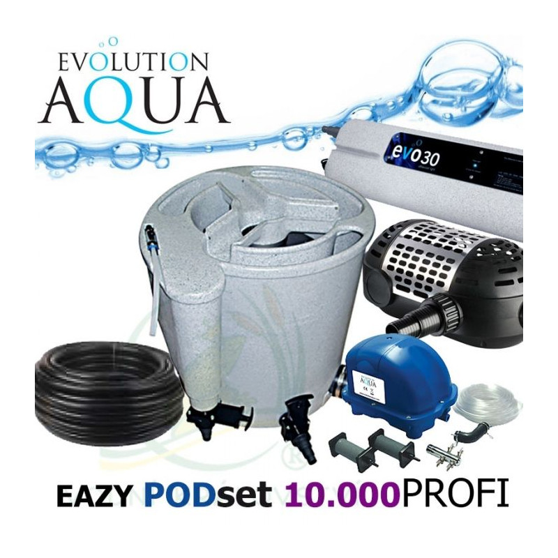 Gravitační jezírkové filtrace v setu Evolution Aqua Eazy Pod set Profi 10000 pro okrasná a koupací jezírka do objemu 15m3. Nejprodávanější a současně nejuniverzálnější profi filtrace na trhu v setu s kompresorem Airtech 70l, vzduchovacích kamenů a rozvodů, UV zářiče evo 30 Watt, čerpadla Perfect 7000, 15 m hadice 32 mm standard, 4 ks stahováků s klíčem, bakterie Pure Pond Black Balls 500 ml, Pure BOMB.