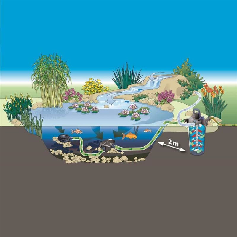 Sestava je ideální pro okrasná jezírka do 13 m³ a díky tlakovému principu umožňuje neviditelnou instalaci se schopností vytlačit vodu do výše položených potůčků.