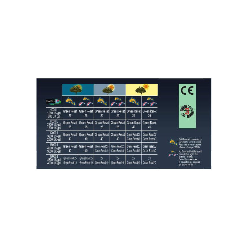 Sicce rybniční filtr Green Reset 40, UV-C lampa a čerpadlo pro zahradní rybníček o objemu do 16000 litrů, s možností chovu Koi kaprů (4-5m3), s obvyklým množstvím ryb do 10m3 (ne koi). Sada obsahuje jezírkovou filtraci Green Reset 40 s vestavěnou UV lampou 20W a čerpadlo Master DW 4000. Tlaková filtrace pro jezírko pracuje na principu biologicko mechanické filtrace. UV-C lampa zničí nežádoucí bakterie, řasy a jiné mikroorganismy.