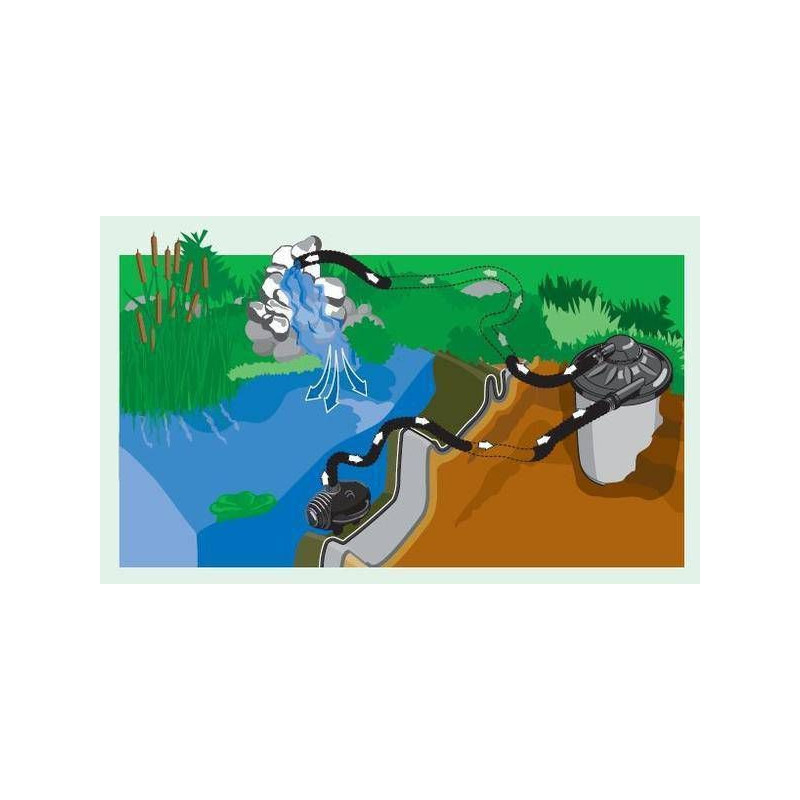 Čerpadlo spojte pomocí hadice s filtrem. Vstup je označen šipkou. Na výstup z filtru (šipka ven) připojte hadici a její konec umístěte do vody nebo na vrchol potůčku nebo vodopádu. Čerpadlo vložte do vody a připojte k el. proudu. UV lampu připojte k el. síti. UV-C zářivka se mění každý rok za novou.