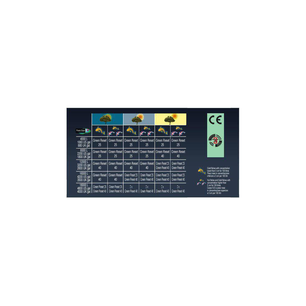Filtrační sestava (sada, set) pro okrasná jezírka Green Reset 40 NFPX 3500 pro nádrže 16000 l bez ryb, s karasy, jeseny 10000 litrů nebo s kaprovitými rybami do 4000 litrů (viz. tabulka pod obrázky). Set tvoří tlaková rybníčková filtrace Sicce Green Reset 40 s UV lampou 20W včetně zářivky a čerpadlo NFPX-3500 s druhým vstupem na připojení skimmeru.