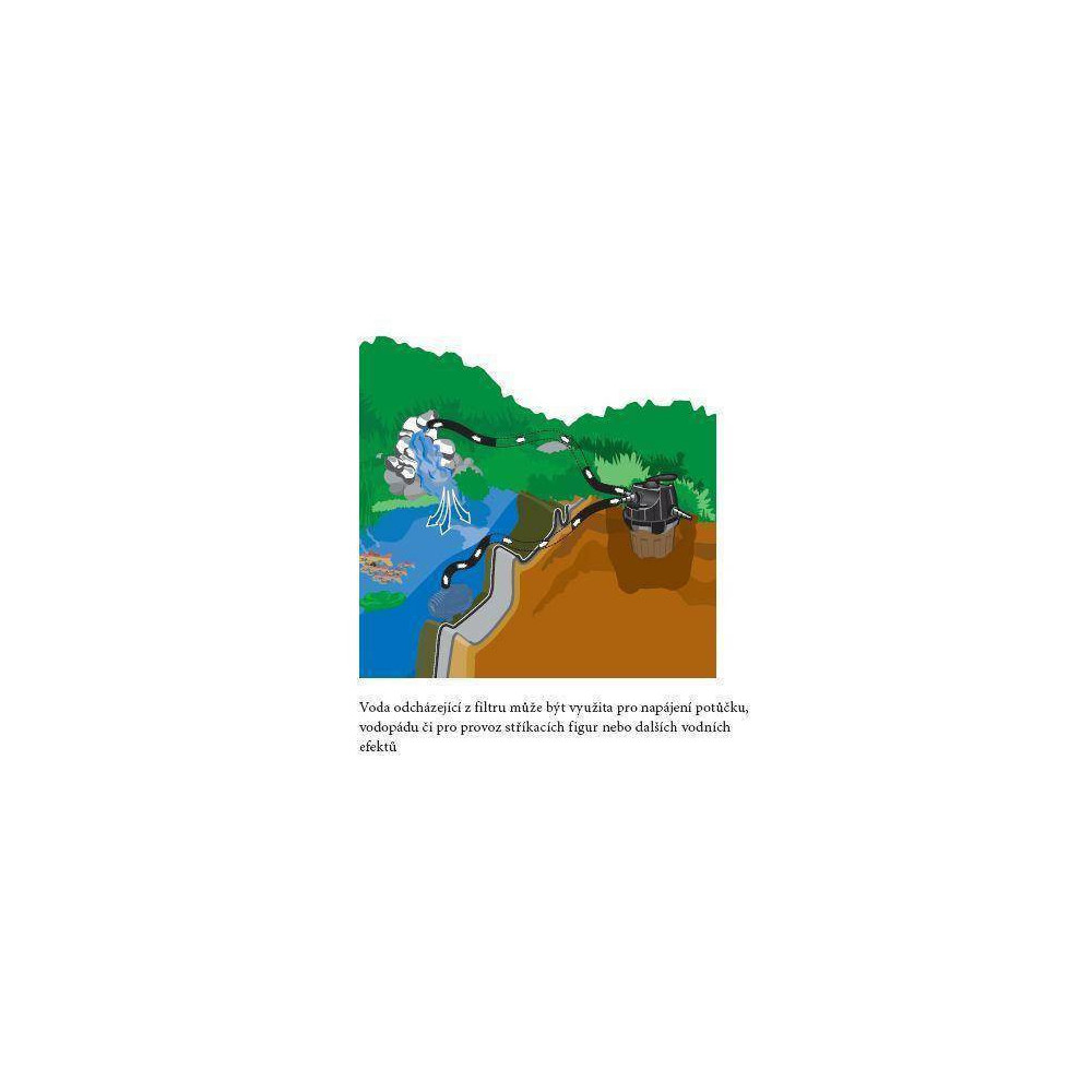 Čerpadlo spojte pomocí hadice s filtrem. Vstup je označen šipkou. Na výstup z filtru (šipka ven) připojte hadici a její konec umístěte do vody nebo na vrchol potůčku nebo vodopádu. Čerpadlo vložte do vody a připojte k el. proudu. UV lampu připojte k el. síti. Všechny UV-C zářivky je třeba měnit každoročně, nejlépe na počátku sezony, za nové.