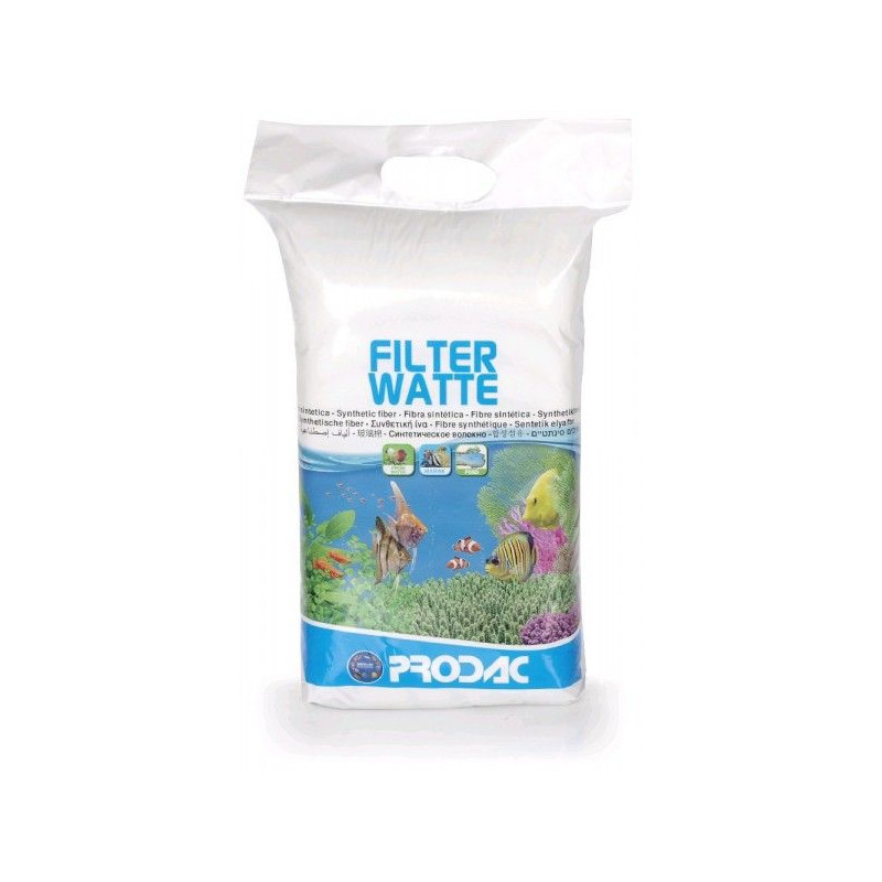 Filtrační vata Prodac Filterwatte 250g do akvarijního filtru - hrubé a silné vlákno pro mechanickou filtraci. Tato akvarijní vata je vyrobena ze speciálních syntetických vláken udržujících neměnící se tvar a to i při procesu filtrace a tím zaručuje kvalitní mechanické čištění vody.