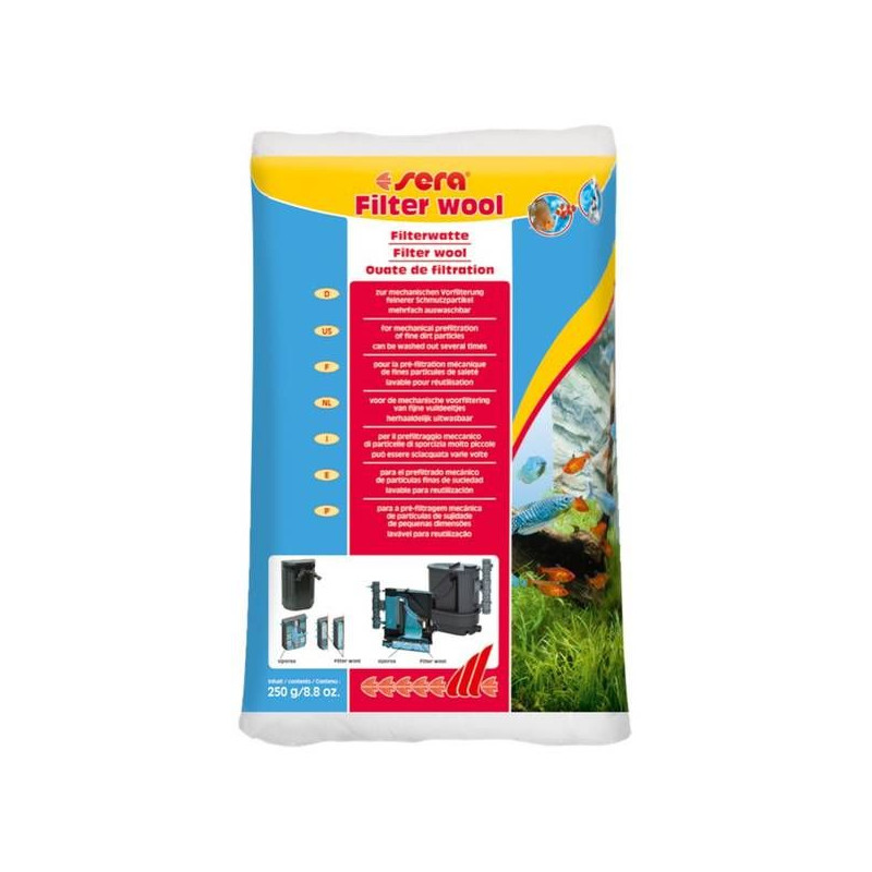 Filtrační materiál do akvarijních filtrů SERA filtrační vata bílá 250g. Vata pro čištění akvarijní vody se vkládá do filtrace nebo předfiltru. Zachycuje jemné nečistoty. Skládá ze stabilních vláken, která zadrží jemnější částečky nečistot po dlouhou dobu, aniž by se slepila dohromady. Sera filtrační vatu lze několikrát vyprat. Pro filtraci sladké i mořské vody.