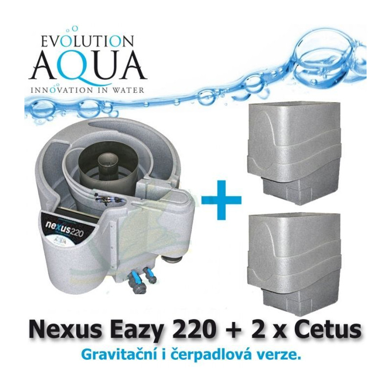 Evolution Aqua Nexus Eazy 220 EAST PLUS (v gravitační i čerpadlové verzi) + 2x mechanický předfiltr Cetus Sieve, filtrace pro koi jezírka a chovy ryb do 70 m3, pro okrasná a biotopy do 210 m3, včetně 18 l K1 Micro a 50 l K1+, 60 měsíců záruka