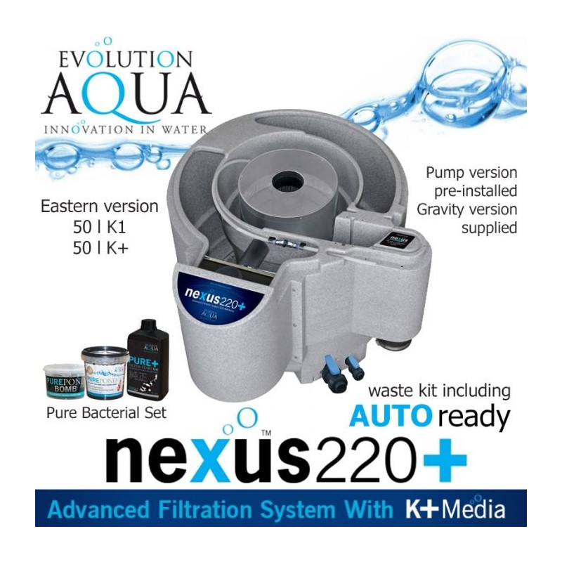Řada Nexus EAZY, to je díky technologickému návrhu, zpracování a Kaldnes mediu na 100% nejúčinnější biologická a díky K1 Micro i mechanická filtrace na trhu v této cenové kategorii. Model 220 je dodáván společně se 18 litry K1 Micro v mechanické části a a 50 l K+ v biologické části. Možné rozšíření až o 150 litrů K1, nebo K+ do biologické části. Filtrace je vhodná pro koi jezírka a chovy ryb do 18 m3, pro okrasná jezírka a biotopy do 125 m3, dle způsobu použití a instalace. U menších jezírek je dostačující Eazy Pod. Pro rozšíření účinnosti mechanického filtrování a snížení četnosti čištění je vhodné doplnění o mechanickou screenex filtrace Cetus. Filtrace jsou dodávány s výbavou pro gravitační i čerpadlové zapojení, předinstalace je pro čerpadlové zapojení.