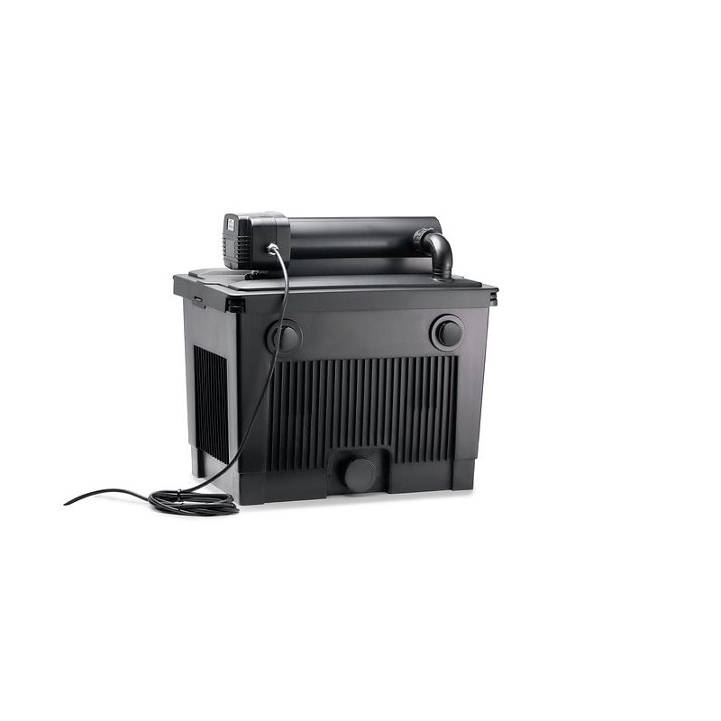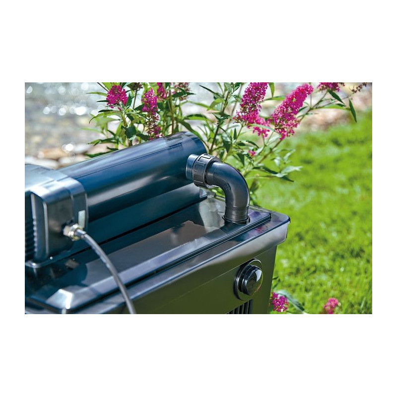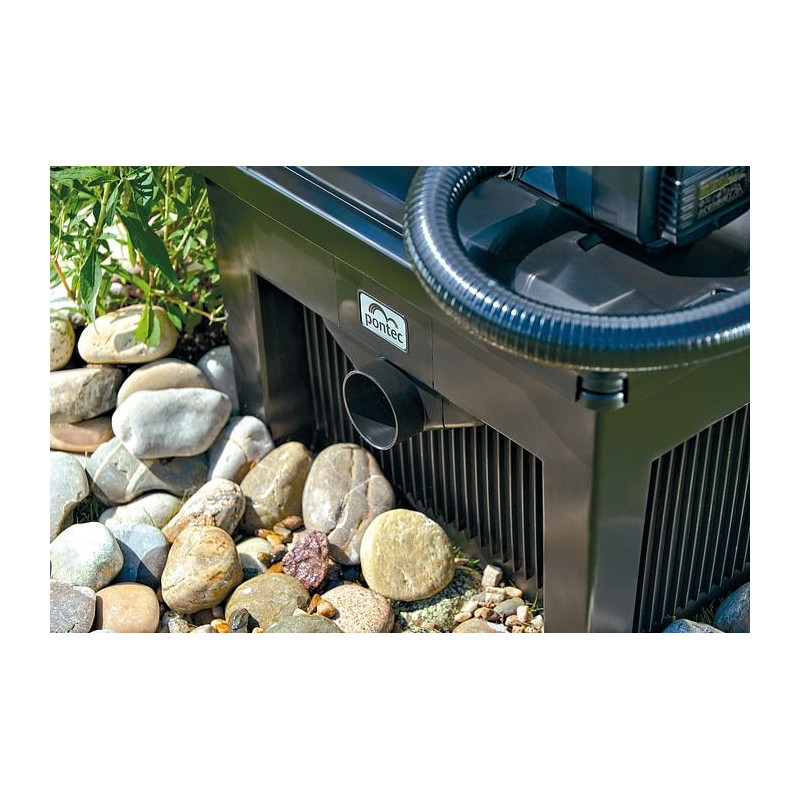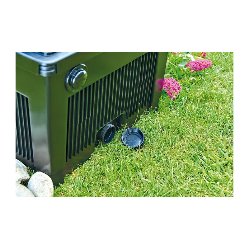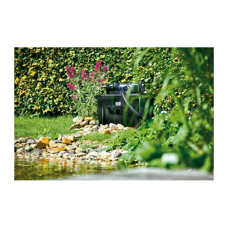Těleso filtru lze zčásti zapustit do země, což usnadňuje jeho skrytou instalaci a nijak nenarušuje vzhled zahrady. UV-C lampa o výkonu 18 W účinně eliminuje zelenou vodu a potlačuje růst jednobuněčných řas.