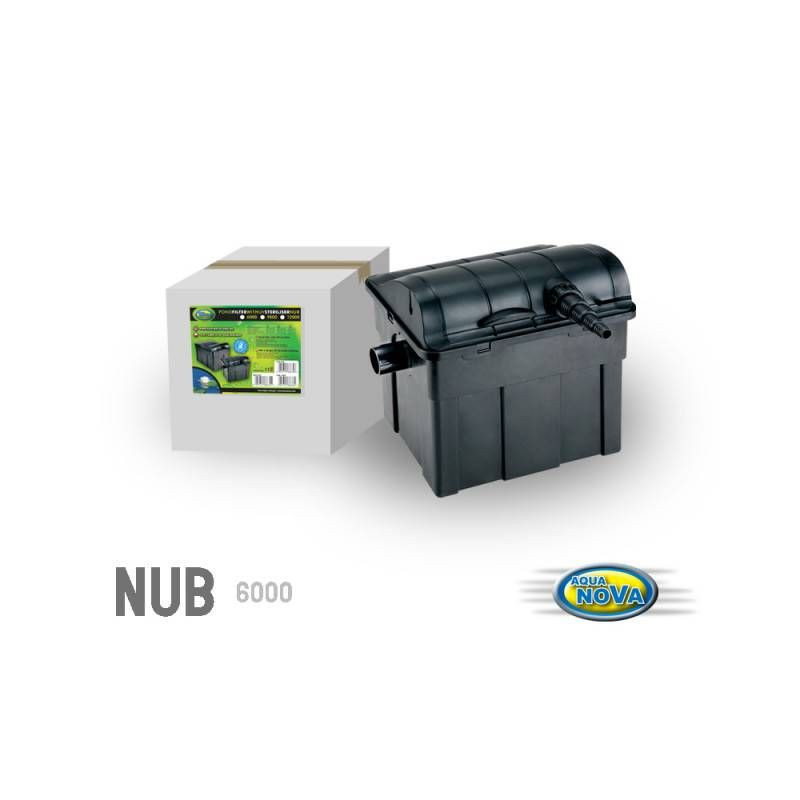 Jezírková filtrace s UV lampou 9W NUB-6000 Aqua Nova pro okrasné jezírko bez ryb do 6000 litrů, s běžným množstvím ryb 3000 litrů (ne chovných ryb jako jsou kapři, KOI kapři apod.). Gravitační beztlakový jezírkový filtr obsahuje filtraci pro jezírko se zabudovanou UV lampou a zářivkou. Vícestupňová filtrace do jezírka je vybavena různými filtračními hmotami jako jsou filtrační pěny a bioelementy. Voda z filtru vytéká samospádem.