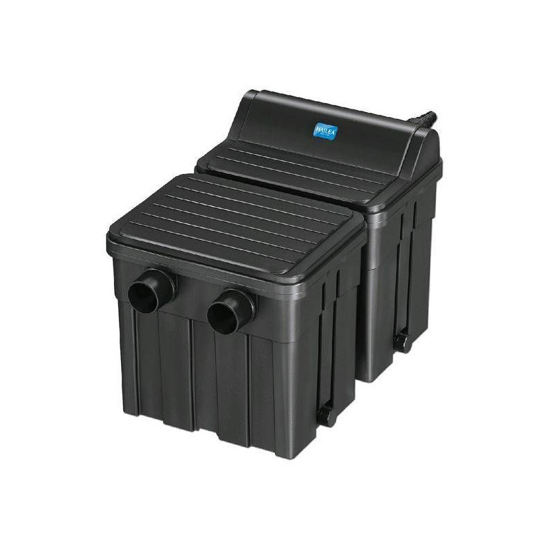 Jezírkový filtr Hailea G16000 ve vylepšené verzi nyní s UV lampou 18W patří mezi gravitační filtrace pro okrasná zahradní jezírka do 24000 litrů. Rybniční filtr pro čistění zahradních jezírek dosahuje úplného účinku, nasadíme-li bakterie pro jezírka do filtru. Čistící bakterie naleznete v oddělení Startovací bakterie. Jezírkové bakterie se množí ve vodě o teplotě 10°C a více. Voda z filtrace vytéká samospádem. Protože má filtr 18W UV-C lampu je k ní potřeba výkonné čerpadlo do 12000 l/h.