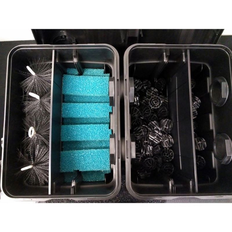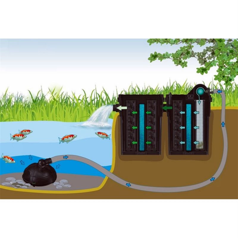 Rozměrově velký průtokový filtr: Filtrace disponuje velkou kapacitou jak pro průtok vody, tak objemem filtračních médií. To umožňuje efektivní biologicko-mechanické čištění vody ve vašem jezírku.