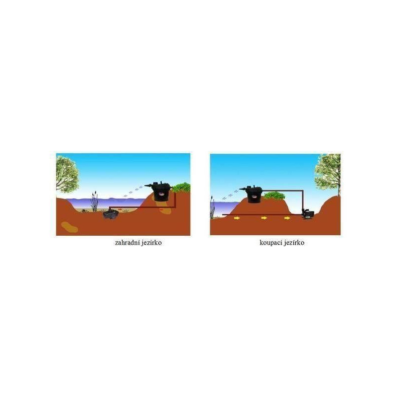 - Instalace: Filtr se instaluje na břeh jezírka (nad hladinu vody), odkud voda vytéká samospádem zpět do nádrže nebo do potůčku.