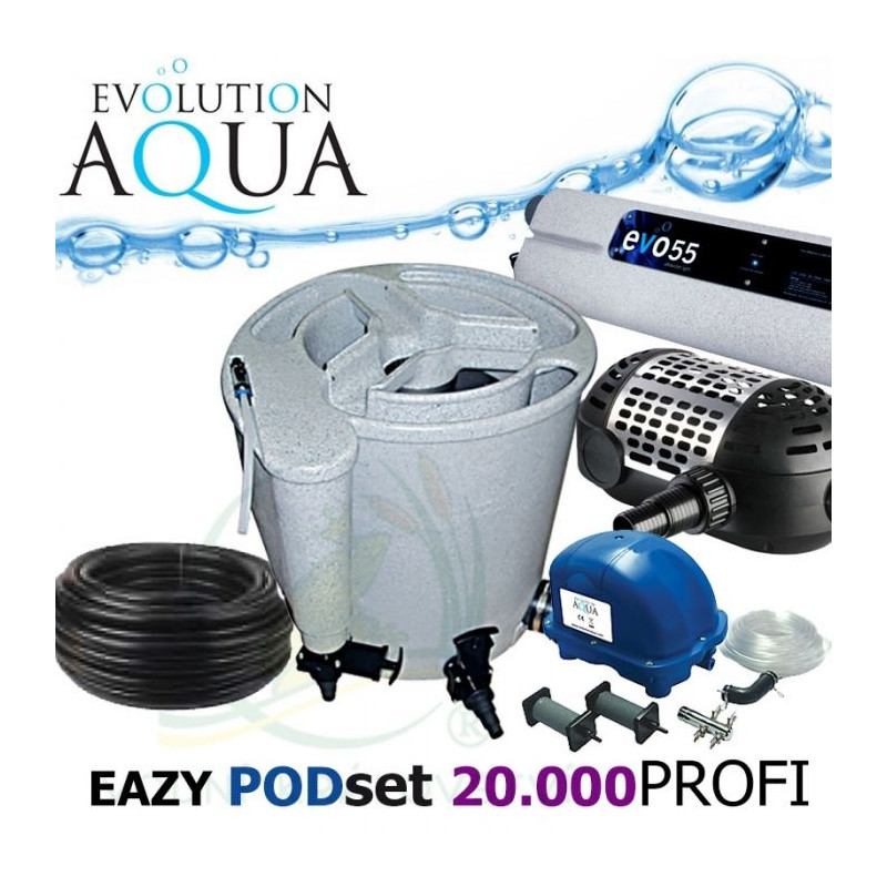Jezírkový filtrační set známé značky profesionálů Evolution Aqua fungující systémem vortex. Obsahuje filtr Eazy Pod, vzduchování Airtech 70 a další komponenty potřebné ke spuštění.