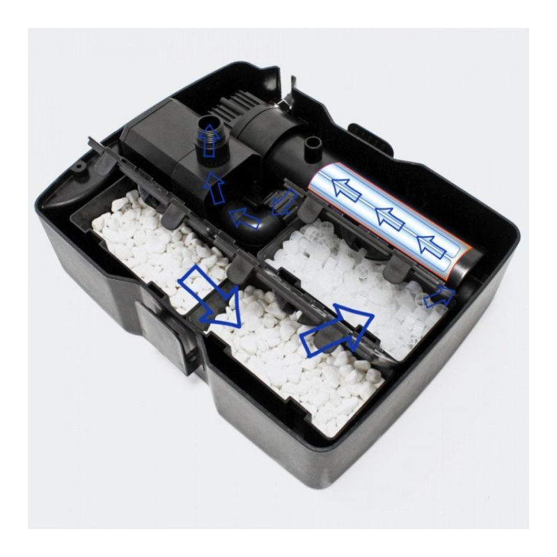 Mechanickou filtraci zaručuje houba umístěná těsně pod krytem filtru. Voda je nejprve vyčištěna a poté odeslána do speciálních oddělení pro filtrační média. Přihrádky jsou vyplněny biologickými vložkami, keramika a biokuličky odpovědné za rozklad nebezpečných sloučenin nacházejících se ve vodě. Vložky lze vyjmout pro čištění nebo vyměnit za nové.