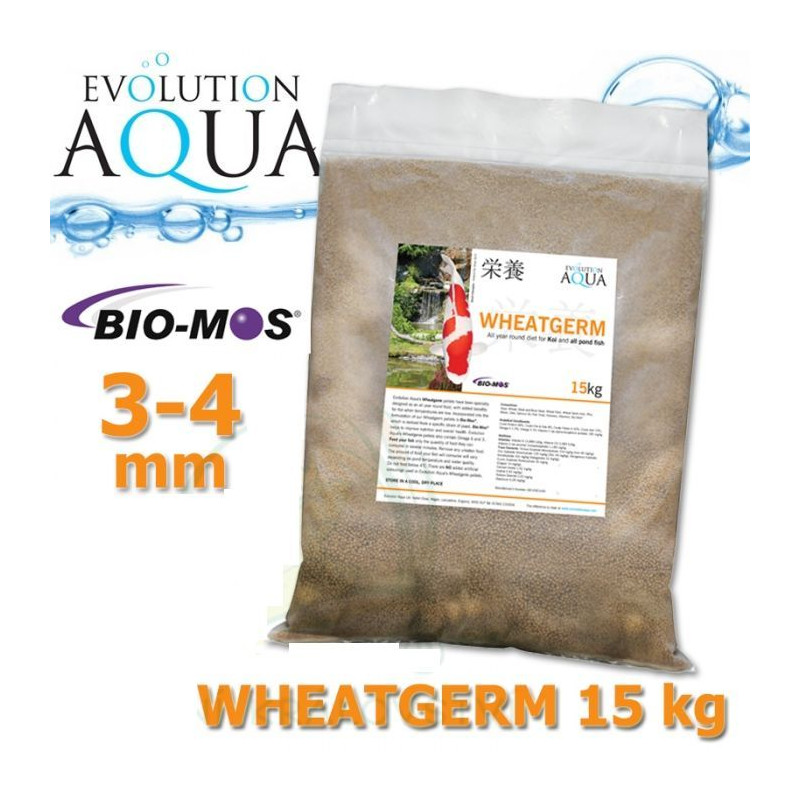 Evolution Aqua WheatGerm (Wheat Germ) 15 kg je nejlepší zimní a jarní krmivo pro ryby v rybníčku a především pro KOI kapry. Kvalitní rybí krmení pro teploty vody od 4°C. Je extrémně lehce stravitelné. Ganule velké 3 - 4 mm se hodí i pro malé ryby od 7 - 10 cm velikosti. Obsahuje Bio-mos pro podporu svalového růstu a posílení imunity a pro dočišťování vody v jezírcích. Dále obsahuje veškeré potřebné minerální látky a vitamíny, ve zvýšeném množství Omega 3 a 6 mastné kyseliny pro posílení imunity a kvalitní trávení. Krmení je vyráběno ze sóji, obilí, ale i živočišných zdrojů. Díky dostatečnému množství bílkovin, tuků a sacharidů je vhodné k celoročnímu podávání. Osahuje pouze přírodní látky, neobsahuje žádná E-čka, stabilizátory ani koloranty, které by mohly způsobovat zakalení vody. Ve spojení s bakteriemi Pure POND BOMB a Black Balls krmivo Wheatgerm podporuje tvorbu biofilmu na kamenech a ve filtracích. V chladných měsících vhodné jako hlavní krmivo, připadně je vhodné míchat s PondSticks. V létě lze míchat s Profi tříbarevným krmivem, Prime, Grower, nebo i jinými typy krmiv.