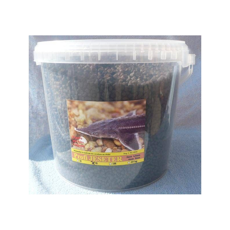 Značkové vysoce kvalitní profi krmivo pro jesetery 10 l, 9 mm granule - krmení pro jesetery. {fabrika_coppens}, které se vyrábí v Německu (žádná náhražka granulemi Ibuki). Kompletní profesionální {alltech_coppens}krmivo klesající ke dnu pro všechny jeseterovité ryby, nezakaluje vodu. Krmivo pro jesetery je prémiové, růstové krmivo. Základními surovinami pro výrobu jsou rostlinné, rybí a krevní proteiny, které jsou pr o jesetery velmi vhodné. Díky stabilitě tohoto krmiva se minimalizuje znečištění. Dobré přírůstky umožňuje správná vyváženost použitých ingrediencí a vysoká energetická hodnota krmiva. Toto osvědčené růstové krmivo je vhodné pro všechny druhy jeseterů. {jeseter}
