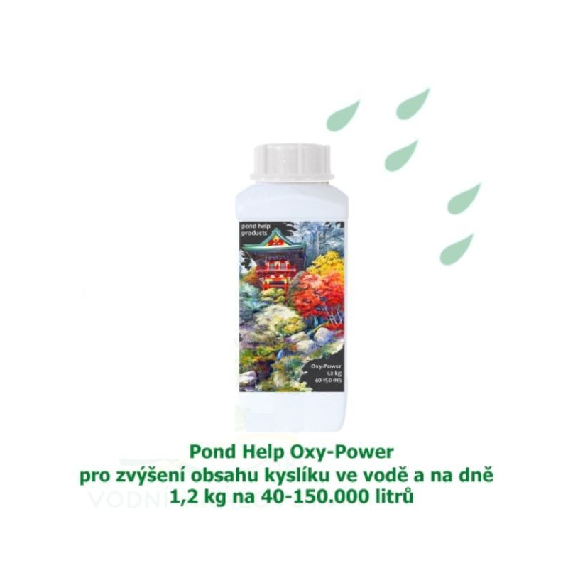 Pond Help Oxy-Power, 1,2 kg na 40-150 m2 je krystalický kyslík pro zvýšení O2 ve vodě jezírka. Vysoce krystalický kyslík do vody podporuje přirozené čištění jezírka. Oxy-Power urychluje biologický rozklad organických nečistot a usazenin na dně jezírek a snižuje množství a tvorbu nebezpečných plynů na dně.