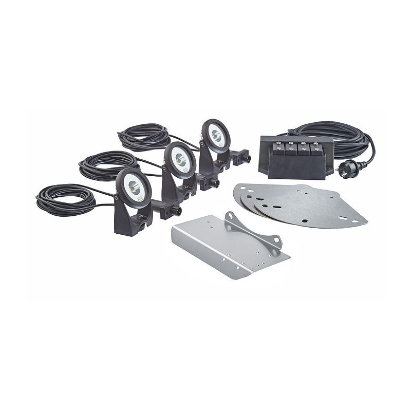 V rozsahu dodávky je zahrnuto: 3x LunAqua Power LED reflektor, 3x přidržovací braketa pro svítidla, 1x ovládač s kabelem o délce 20 m, trafo
