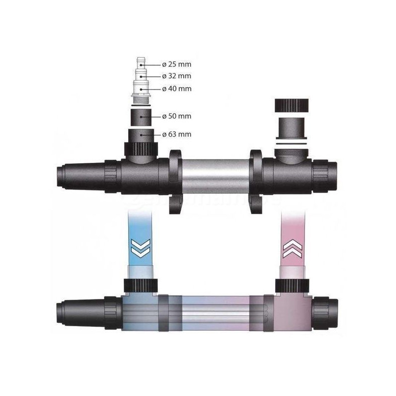 oceli. Profi-Heater se muže napojit na rybniční hadici nebo PVC-trubku. Součástí dodávky topného tělesa patří i hadicové a trubkové spojky bez nežádoucího pnutí.