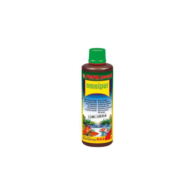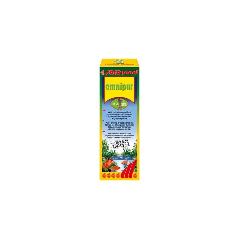 Přípravek pro ryby Sera Pond Omnipur 500 ml bojuje proti nejčastějším strastem ryb v okrasném zahradním jezírku jako jsou bakteriální infekce, hniloba ploutví, plísňové infekce (Saprolegnia, Achlya), kožní paraziti (Costia, Chilodonella), Trichodina, Oodinium, žaberní a kožní červi ( Dactylogyrus nebo Gyrodactylus). Po aplikaci přípravku Sera Omnipur může výkon filtru o několik málo procent klesnout, ne příliš moc. Proto se doporučuje po ukončení ošetření dodat do jezírka a filtru filtrační bakterie např. Sera Bio Nitrivec nebo další z našeho sortimentu.