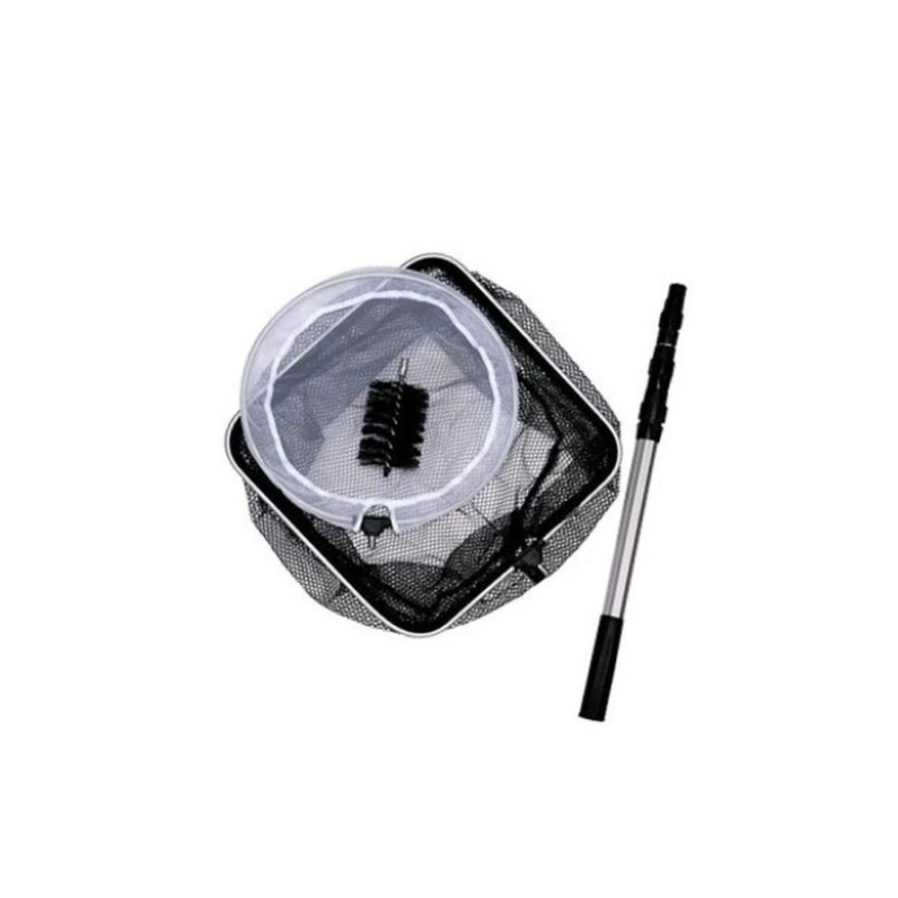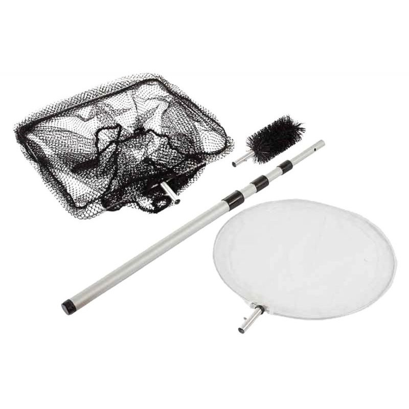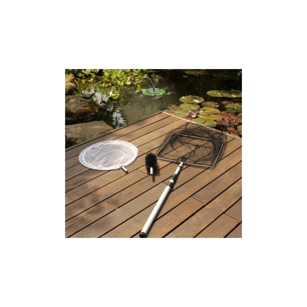 Součástí sady jsou dvě jezírkové síťky a kartáč na řasy, které snadno nasadíte na teleskopickou hliníkovou násadu. Jemná síťka je ideální pro pyl, semínka, drobné lístky a shluky řas, zatímco hrubší síťka si poradí s listím, odumřelými rostlinami i menšími větvičkami. Kartáč účinně odstraní vláknité řasy z kamenů, fólie nebo okrajů jezírka.