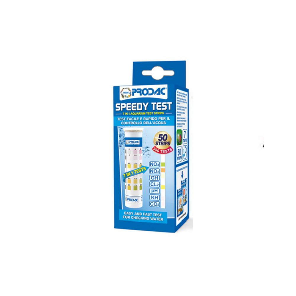 Sada testů Prodactest Speedy test 7 v 1 pro rychlý a přesný test pro zjištění hodnot KH, pH, Cl2, GH, NO2, NO3 a CO2 ve sladké i slané vodě, vhodný pro akvaristiku i do zahradních jezírek.