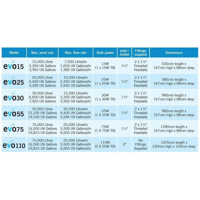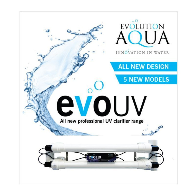 UV lampy Evolution Aqua evoUV přináší efektivnější a hospodárnější výkon než dříve. Tato řada zahrnuje zcela přepracované modely 30 wattů a 55 wattů, nový model 15 wattů a 25 wattů, ideální pro použití na menším zahradním jezírku, spolu s verzí 75 wattů a 110 watty.