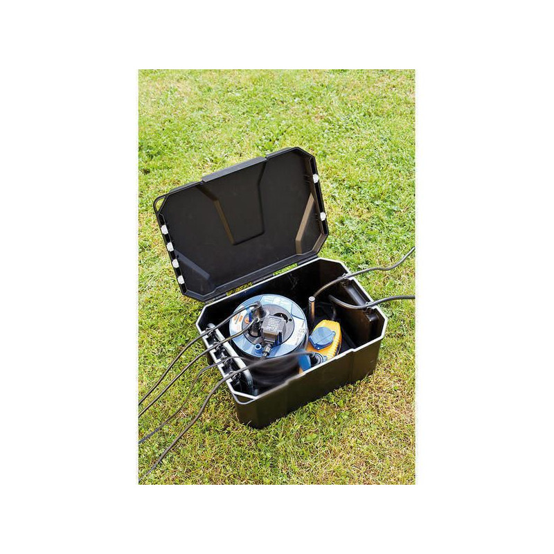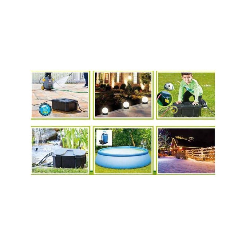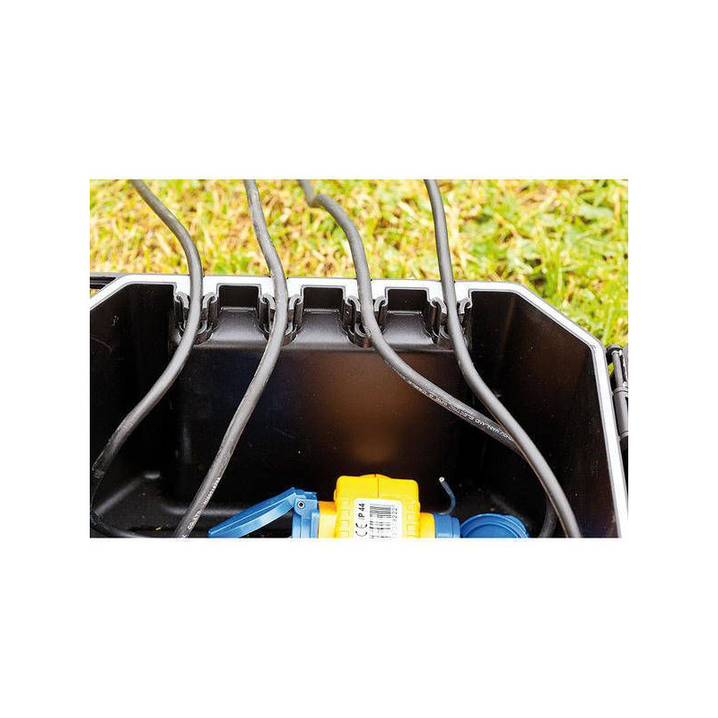 Tento problém řeší zahradní bezpečnostní Power Box, umožňuje bezpečné centrální a čisté uložení rozvodů elektrických kabelů. Nabízí dostatečné místo pro prodlužovací lišty, prodlužovák bubnový, časovače, atd..