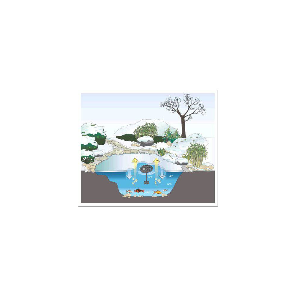 Rozmrazovač do jezírka pro udržování jezírka bez ledové pokrývky IceFree 4 Season obsahuje odolný plastový plovák a malé fontánové čerpadlo. Tato sada usnadní všem obyvatelům jezírka přezimování. Sebemenší množství teplejší vody udrží místa kolem plovoucích těles bez ledové pokrývky do cca –20° C. Je tak i v nejhlubší zimě zajištěna životně důležitá výměna kyslíku a plynů. Nenápadný design nebude v jezírku působit rušivým dojmem, přesto však dovede odvést hnilobné plyny ven z nádrže a zajistit tak optimální pohodu pro přezimování Koi kaprů, jeseterů i jiných druhů ryb v jezírkách. Zařízení je schopno udržet stálou úroveň kyslíku ve vodě a zajistí tak pohodu pro přezimování Vašich rybek. Přístroj je ideálním řešením, aby povrch jezera v určitém místě zprošťoval ledu. Plynulé doplňování 2 - 4° C teplé vody kolem plovoucího tělesa v okruhu 20 cm udržuje v bezledovém stavu. Celá sada s čerpadlem s kapacitou 420 l/hod.